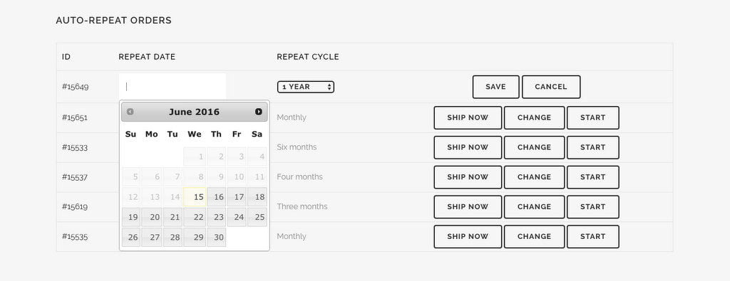 CUSTOMERS – Customers can view all of their auto-repeat orders from their Account page. Customers can choose to ship now, delay the autoship order, skip a auto-repeat cycle, set any date in future from a calendar to start auto-repeat orders. Simple, easy management of auto-repeat orders.