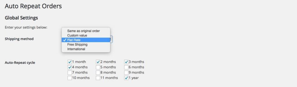 Our autoship extension automatically added a auto-repeat dropdown box on the cart page. It’s a simple, 2 click solution to enable automatic ordering and shipping for WooCommerce stores.